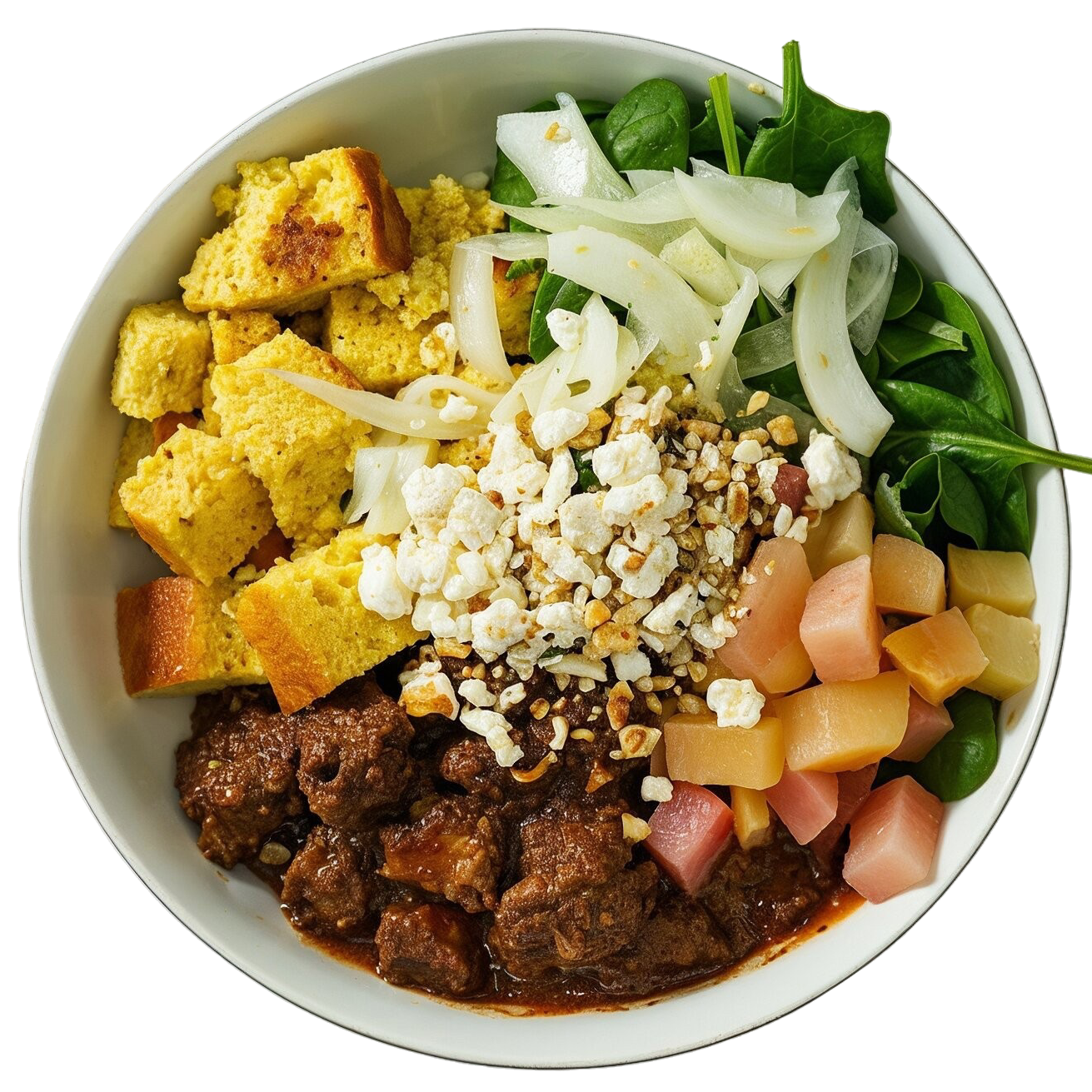 Zloženie: Bravčové v mole omáčke, kukuričný bochník, mexický Vinaigrette, Chioggia cvikla, fenikel, baby špenát, Popcorn Crunch posyp, Maldónska soľ