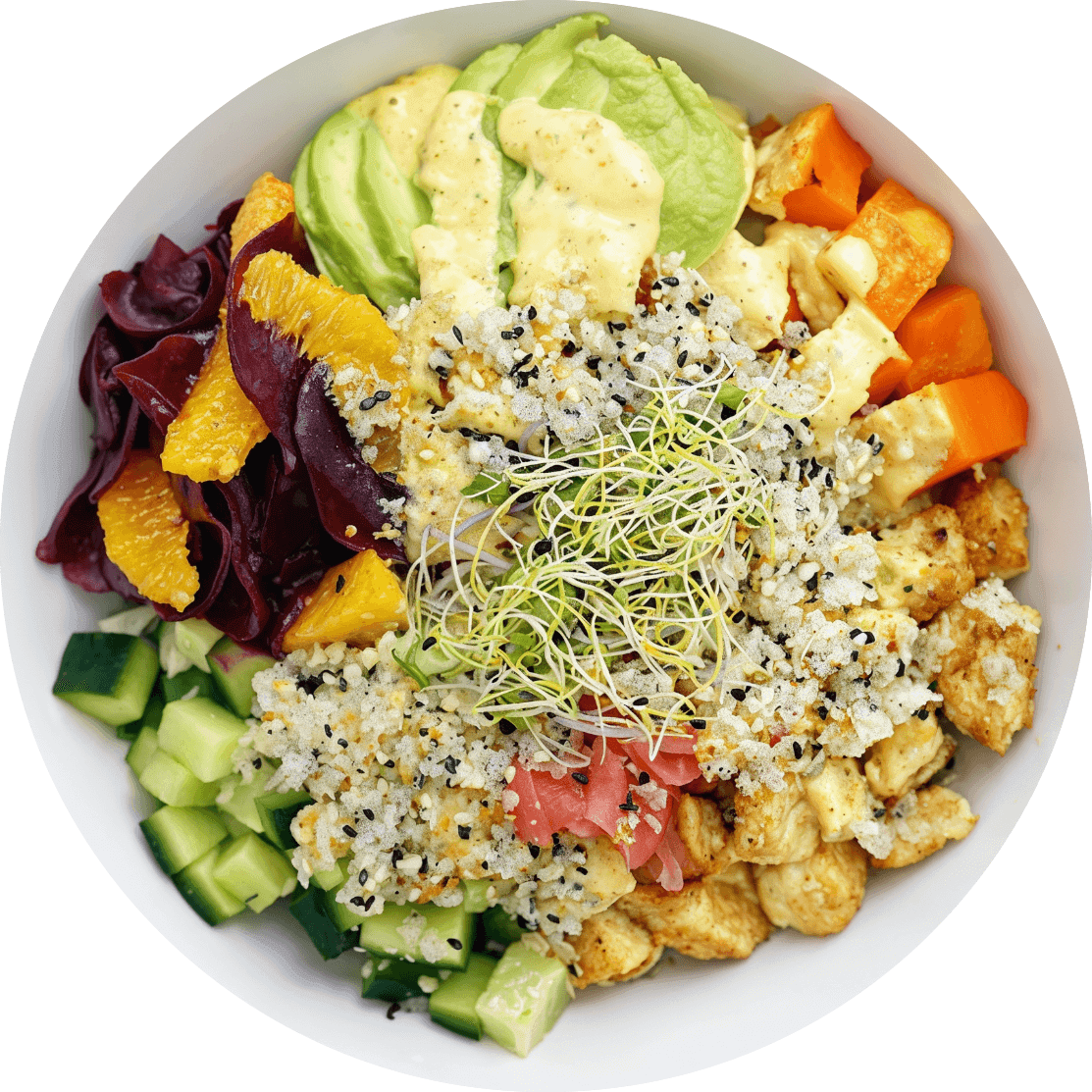 Zloženie: Ryža, kuracie prsia, avokádo, pečená tekvica, cviklovo-pomarančový šalát, avokádo, uhorka, nakladaný zázvor, mix výhonky, Larb Crumble posyp, Sweet Chilli Kimchi dressing.